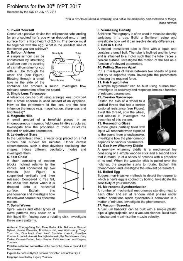 本次比赛的题目采取了IYPT2017的17题(见附件1)中的7道题,分别为第一题, 第二题, 第三题, 第六题,第九题, 第十题, 第十二题。