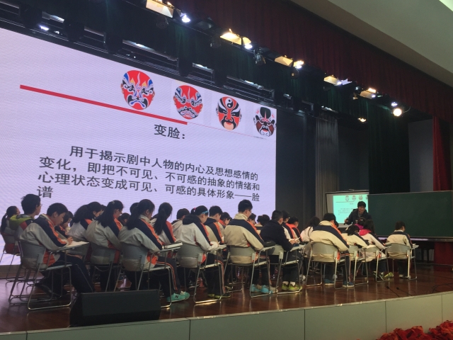南外蒋荣魁老师为大家讲授了一堂有情感、有趣味的戏剧鉴赏课《变脸》。蒋老师从“脸谱”这一物件入手,让学生结合课下注释理解“脸谱”寄寓的人物形象,理解“脸谱”背后的内涵。接着,蒋老师让学生关注本文情节和人物,概括文章节选部分剧情,体会主人公的情绪变化,从而引出“戏剧冲突”这一教学重点,让学生在“戏剧冲突”中,通过“舞台说明”“人物细节”“人物唱词”感受人物性格,特别让学生体会人物内心的矛盾。