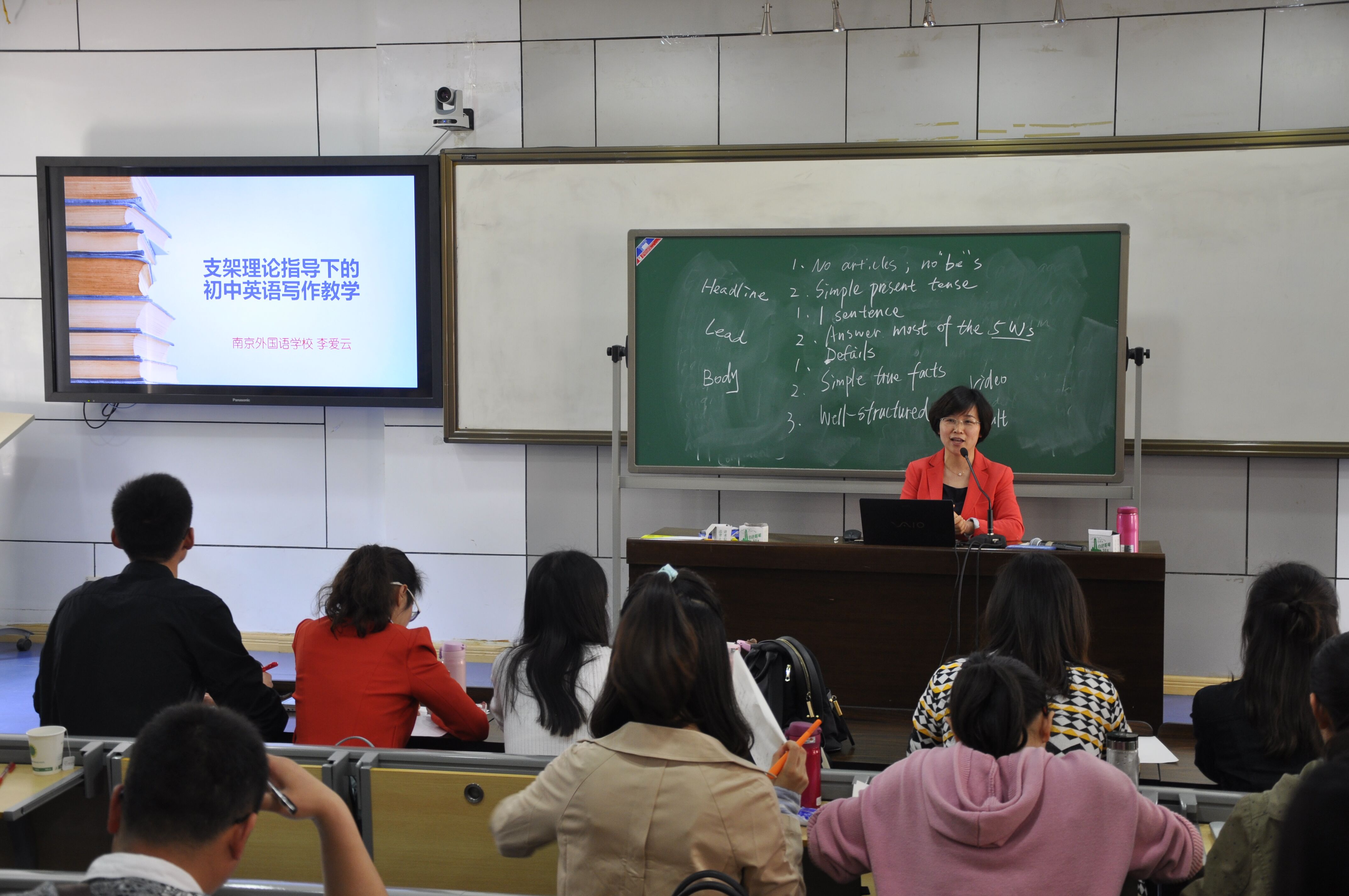 2017年4月24日上午,“南京市初中英语李爱云名师工作室”活动暨南京市初中英语教研活动在永利官网二楼阶梯教室举行。本次教研活动的主题是“支架理论指导下的初中英语写作教学”,旨在研讨和探究如何在初中英语写作教学中,在充分调动学生知识储备的前提下,教师帮助学生搭建写作需要的情境、内容、结构、语言、评价等“脚手架”,以完成不同文体的写作。