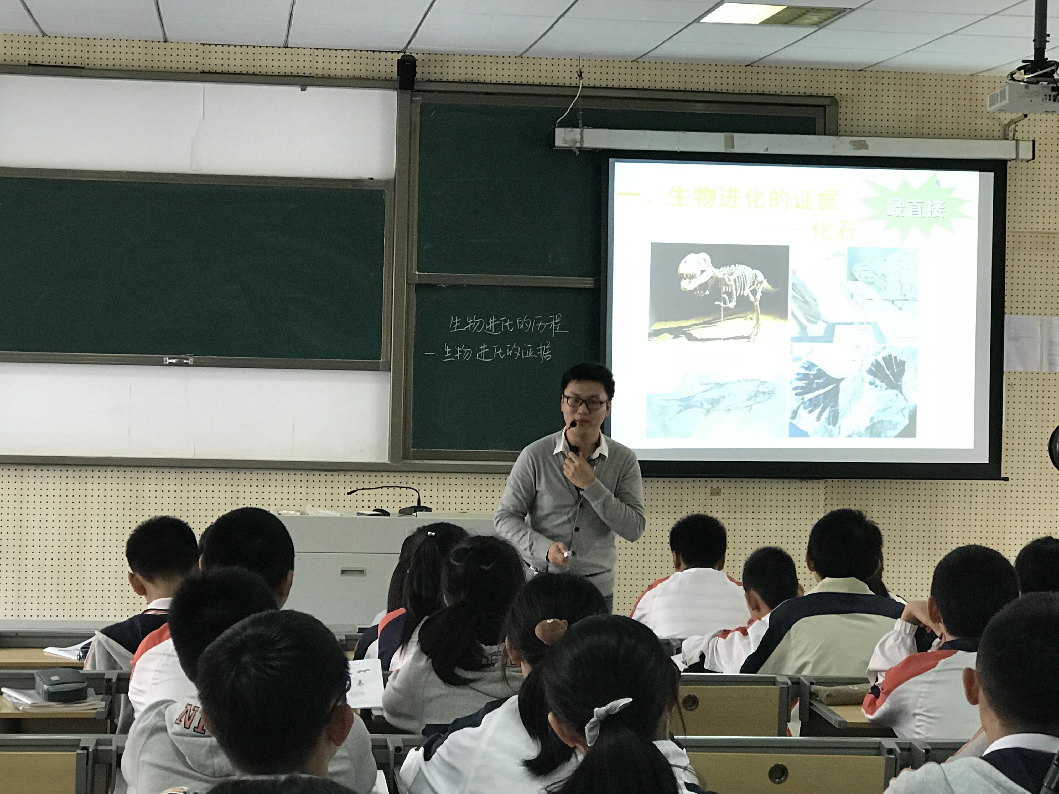接着,人民中学张雷老师就初二《生物进化的历程》一课,从《恐龙》视频导入,引起学生兴趣,通过设计观察化石,讨论马的进化历程和探究始祖鸟与爬行类和鸟类的相同点三个活动,让学生认识化石,理解化石在生物进化历程中的重要意义,发现化石在地层中的分布规律,学生参与度高。