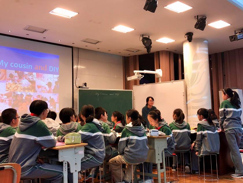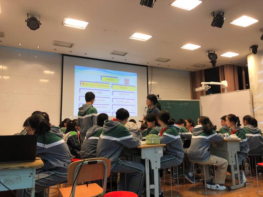 施丽娟老师执教的内容是牛津8A第四单元的Reading,这篇课文的主题是DIY,讲述了Suzy的表哥和DIY的故事。Suzy的表哥酷爱DIY,却不断地犯错。家人给了他很多建议,可是他非常自信,完全不接受,以自己的方式继续对DIY的喜爱。施老师的这节阅读课设计巧妙,教学任务由浅入深,层层递进,尤其关注对学生思维能力的培养。施老师设计了一系列有意义的问题链,比如,“你是否有过DIY的经历?”,“你是怎么看待DIY的?”“我们从Suzy表哥的故事中学到了什么?”,“为什么大家会这么喜爱DIY,究竟DIY能给大家带来什么?”等。在整个教学过程中,施老师通过步步追问引发学生不断思考,通过预测课文内容、提取课文信息、比较观点、联想推断、评价质疑等活动,带领学生一起理解文本信息、挖掘文本内涵、领略文本要义,在推动学生不断思考的过程中培养学生的分析、推理和评价等思维能力。在施老师的不断启发和调动下,学生也由一开始的被动接受到慢慢地开始参与课堂,甚至主动发言,课堂气氛也渐渐活跃起来。