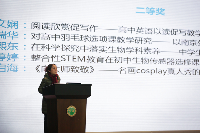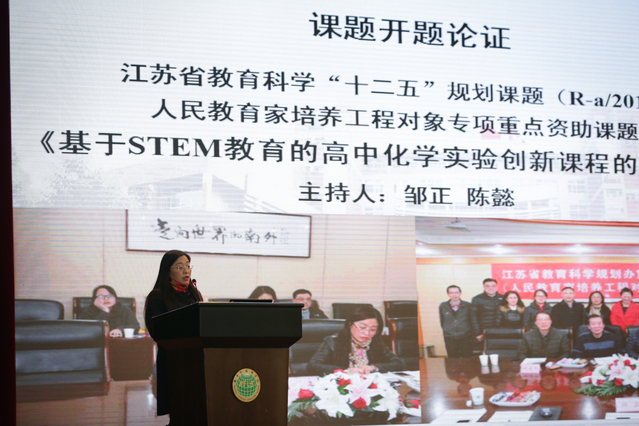 陈懿老师汇报的主题为《教育科研促进教师专业成长——“基于STEM教育的高中化学实验创新课程的开发研究”行与思 》。