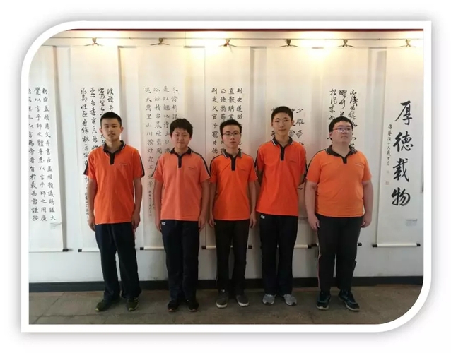 获得全国一等奖(江苏赛区)的牛琨琬辉、钱景晨、袁子珉、路锦熙和冯思远(从左往右)