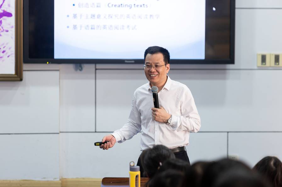 随后,程教授又结合若干版本的阅读教材,就“读什么”、“怎么读”、“怎么教”对在场老师提供指导,他提出英语阅读材料要满足学生的兴趣和发展需要,要真实并且有丰富的文化内涵。在教学过程中要将教师指导和学生自主阅读结合起来,遵循意义优先的原则和阅读的完整性。最后,程教授又在英语核心素养的基础上提出阅读教学要基于语篇教学和主题意义教学,并结合生动教学实例,介绍如何通过课堂教学培养学生的核心素养。