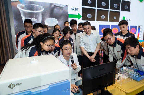 另一堂由化学组吴悦老师主讲“凝胶与水分子探针技术的碰撞”展示课是以化学学科为基础,结合物理和生物学科,让学生了解水凝胶的吸水原理、制备过程以及运用前景。此课程是由南外化学组设计的一门主题式STEM课程,以研究热点水凝材料为主要内容,以水分子探针技术作为主要表征手段,并将二者有机地结合起来。课程首先以生活中学生们常见的物品为切入点引出水凝胶,并以“婴儿尿不湿”为例,教师演示实验验证其中的有效材料,以此解释水凝胶的概念,描述水凝胶的特性。然后,通过人体的磁共振成像与食品中的“注水肉”“僵尸肉”的磁共振分析结果,让同学理解何为水探针技术及其基本原理。接着,指出科研领域内,水分子探针技术在水凝胶中的应用。实验部分则由教师先布置任务,学生制定方案,通过动手实验体验两种不同材料的水凝胶制备过程,并利用水分子探针技术进行表征与分析,师生共同分析数据,验证实验假设。拓展部分由教师介绍水分子探针技术在其他领域内的应用,展示学生想要开展的自己感兴趣的研究主题。最后由一组同学介绍自己的研究课题,教师进行指导点评。