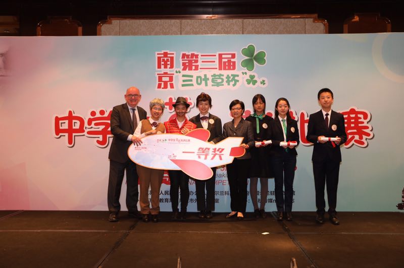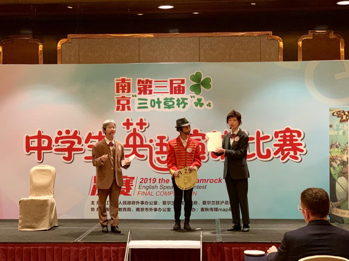 2019年6月1日,南京市第三届“三叶草杯”中学生英语演讲比赛在南京市香格里拉酒店举行。来自南京市的10所初中共30名选手围绕“江苏与爱尔兰的文化和教育”主题,向评委和观众讲述了中爱“友谊之花”、“友城之窗”、“文学之魅”、“创意之都”和“创新之路”的主题故事,抒发了青少年对中爱两国建交40周年的美好祝愿与对未来的憧憬与展望。永利官网初二年级的潘楚珩、张湲林和刘沈钰同学组成的代表队荣获一等奖,并将于暑期赴爱尔兰学习交流。