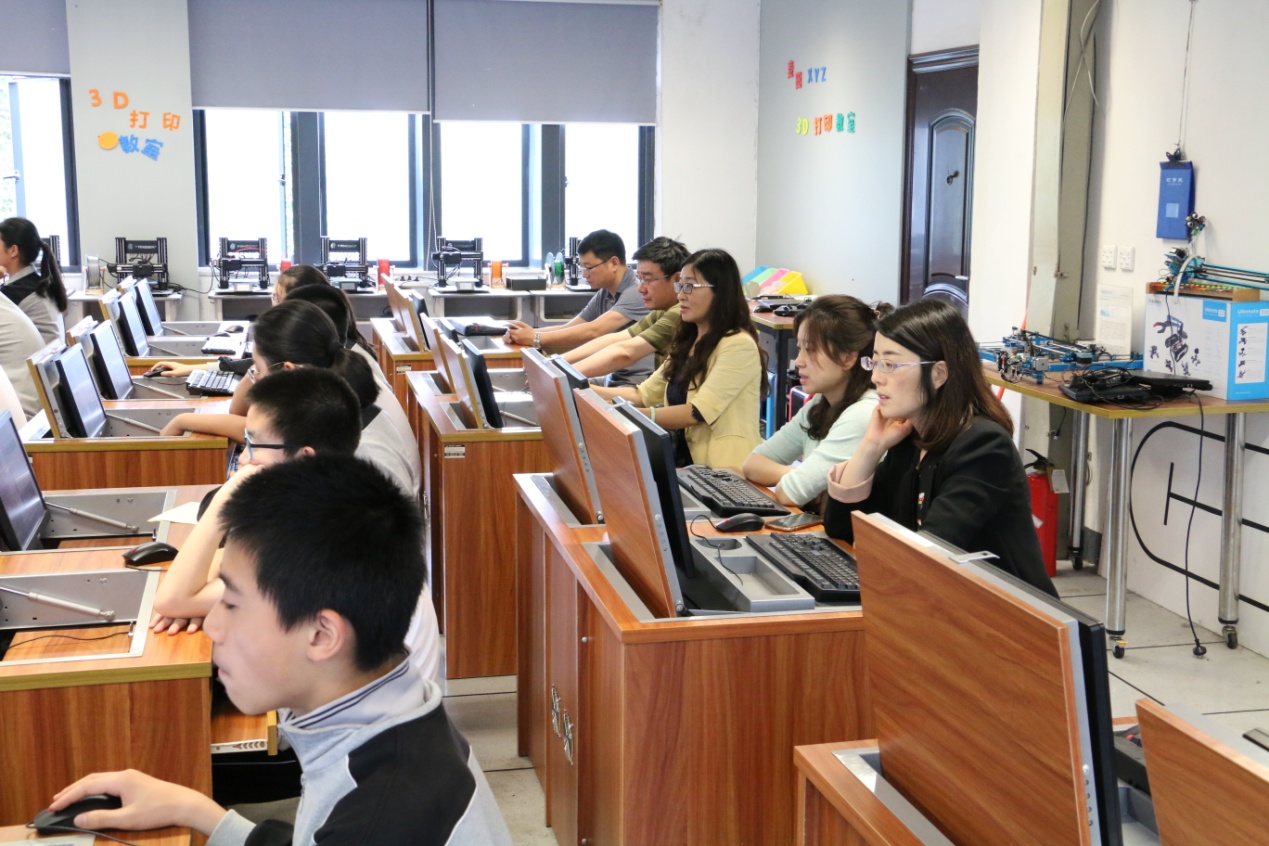 在听课交流环节,浙江省十大教育新闻人物、创客名师戴小红为我们开设了观摩课《processing互动编程:做一个简易画板》,创客教师陈龙为我们讲解了实验中学的创客课程和创音乐队案例,丰富的想象力与创造力,与南外异曲同工,赢得了大家的阵阵掌声。跨界的学习,不仅开阔了我们的视野,也丰富了我们对STEM课程的认识视角和教学思路。