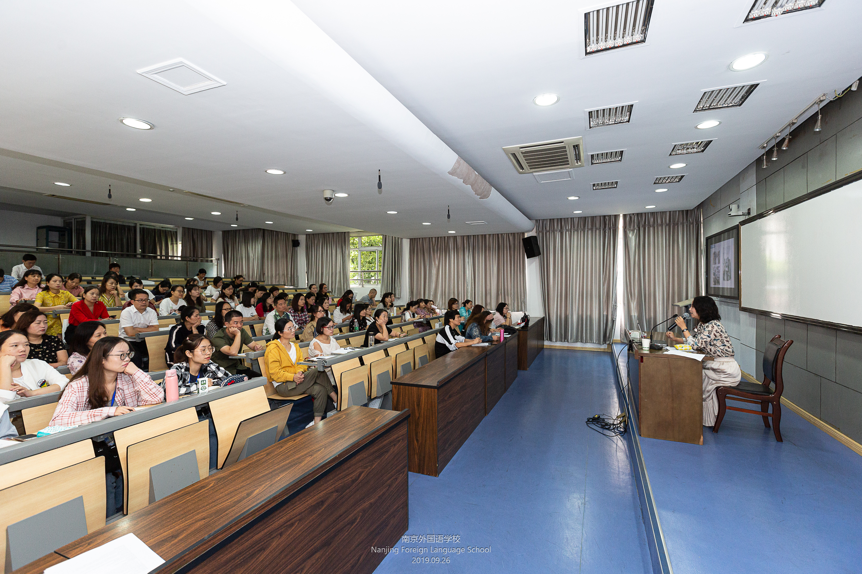 初中英语教研组长朱琳老师做了“学习型英语教研组构建”的主题讲座。朱老师的讲座由“南外初中英语教研组的人员组成”、“教研相长”、“交流学习”和“教研之外”四部分组成。朱老师首先从整体上介绍了教研组的常规工作,主要包括开学初召开教研组大会布置新学期工作,教研组长和备课组长商讨制定新学期教学计划、组织命题与考试质量分析、了解组内老师的教学教研情况;学期末开展教学研讨会,商讨下学期各项活动计划等等。教研组工作事无巨细,每一项都不可或缺。朱老师反复强调we are the team,她将“team”分解成teamwork, efforts, action和motivation四个单词,巧妙概况了英语教研组的特点。她说,作为一个团队,南外英语教研组无时无刻不体现出团队精神,特别表现在办校至今坚持的集体备课制度方面,并展示了老师们集体开发的EIM新教材教学成果,即配套的教材练习册、语法练习册和语音模仿册等。朱老师随后介绍了教研组的试卷命题制度,每一次试卷都由老师们分工独立命题,坚持原创,反复磨卷、探讨后再定稿,充分体现了南外英语老师精益求精、认真负责的教学态度。教研组组织老师们多年来不断学习,实现自我提升,通过“走出去”参加各种教研活动与兄弟学校交流互动;借助“请进来”邀请教育界大师莅临讲座、外籍教育专家开设workshop等形式多样的活动为老师们提供提升平台。朱老师还详细介绍了南外英语主题阅读教学模式的各种做法,向老师们展示了学生的外语阅读书单,外语节、读书节等活动的丰富图片。最后,朱老师幽默地指出南外的英语老师不仅教学教研在行,教研之外的生活同样精彩纷呈。老师们工作之余自行组建了乐书会共读好书美文,参加插花、陶艺、绘画等课程提高艺术修养,从而成就更全面的自我。