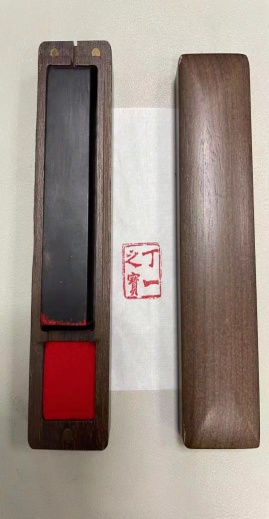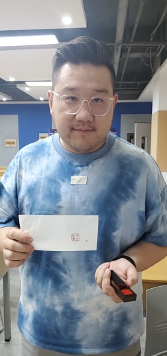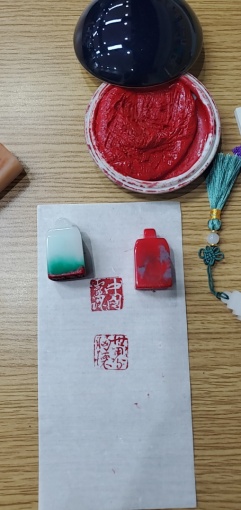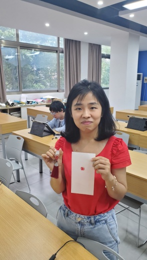 与此同时,大家在艺术组郑俊等老师和外请专家的指导下,大家陆续完成了印面的设计,然后传给篆刻机器,短短半小时刻好了4枚印章,大家拿到属于自己的印章都非常开心,纷纷拍照留念,沉浸在这种崭新的艺术与科技结合带来的美感中。