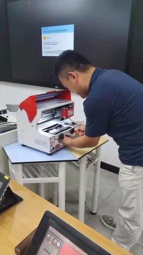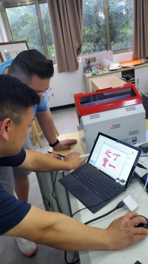 20分钟篆刻知识讲完后开始实操,刘老师又花了15分钟时间,教授并示范了如何用画时印章软件设计一枚印面。毕竟是Stem教师团队的老师,这些技术分分钟搞定。大家一致推选现场打印本次活动信息技术指导曹蓉老师的印章。设计好的印面通过软件传输到数字篆刻机上,10分钟后,一枚别致的印章制作完成。